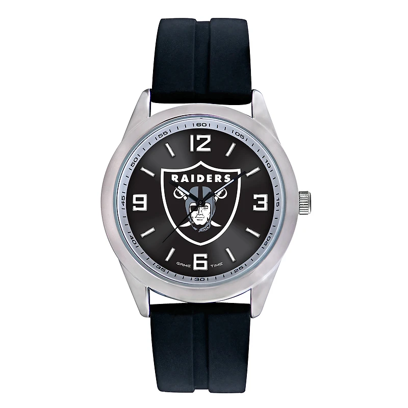 Keep track of every second with this Las Vegas Raiders Playmaker Watch. This stylish timepiece boasts the Las Vegas Raiders iconic logo and colors prominently displayed on the dial. The silicone strap, fastened with a durable stainless-steel sports buckle, provides a comfortable and secure fit for cheering on your favorite team.