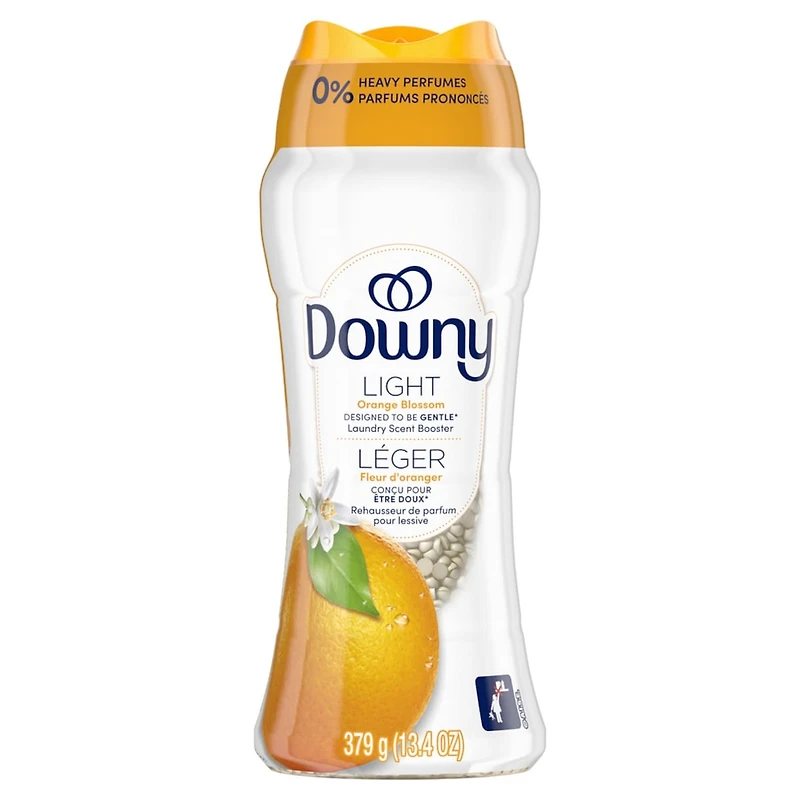 - LIGHT SCENT: In-wash scent beads that provide a light boost of scent, made with no heavy perfumes, no dyes, and no phosphates;ALL-DAY, LONG-LASTING FRESHNESS: Downy Scent Booster delivers 4x longer-lasting freshness* *vs the leading detergent alone;EASY TO USE: Just toss these gentle, lightly scented laundry scent booster beads into your washer before adding fabrics;SAFE FOR ALL LOADS: Downy Light Fabric Scent Beads can be used on all colors and fabrics, and are safe enough to use in all washing machines;ORANGE BLOSSOM: Experience the refreshing and calming fragrance of citrus with subtle floral notes, reminiscent of sunny seasons;Includes one 379g bottle of Downy Light Laundry Scent Booster Beads in Orange Blossom scent