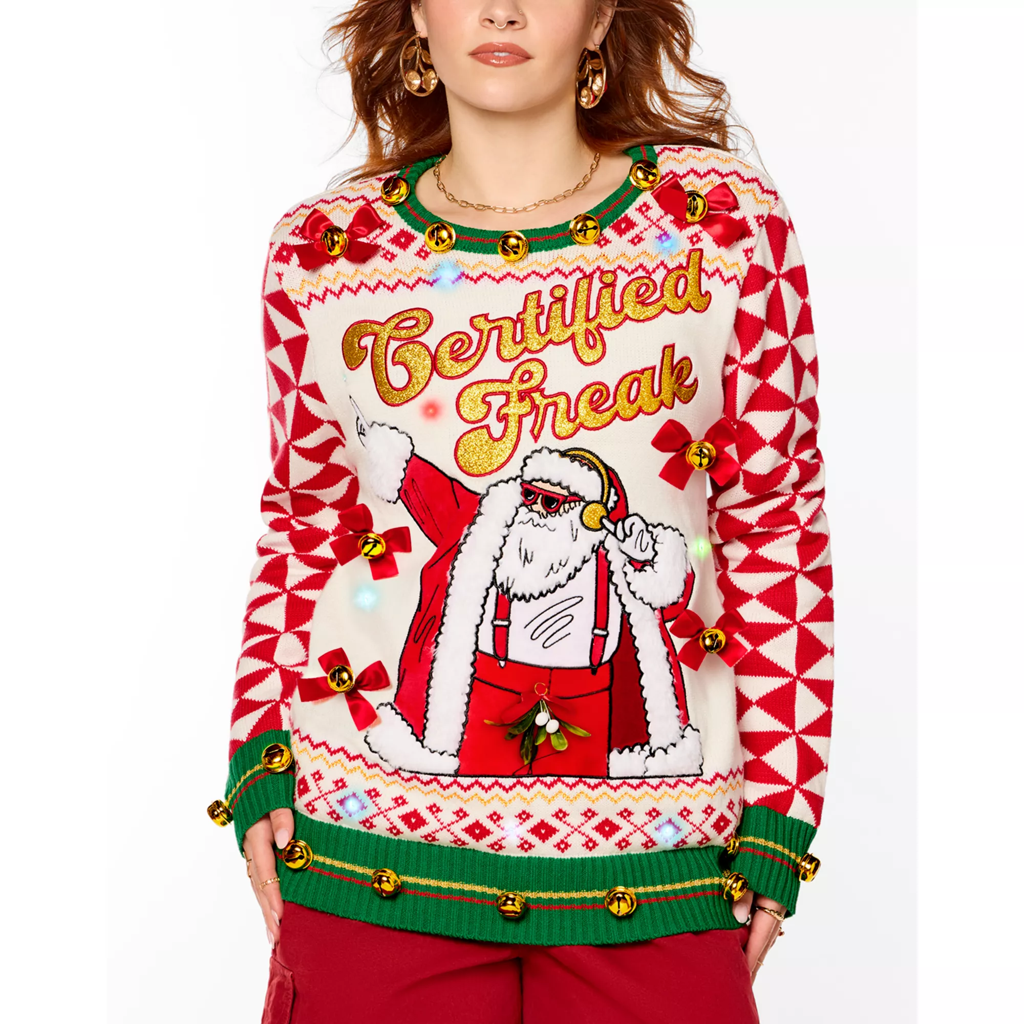 Embrace your wild side this holiday season in this Light-Up Santa Certified Freak Christmas Sweater! This cheeky light-up sweater cycles through 3 different blinking modes, features red bows adorned with jingle bells dangling mistletoe, and even plays catchy tunes to get you dancing! Perfect for those who like to mix a little mischief with their holiday spirit, this sweater ensures you’ll be the life of any party.