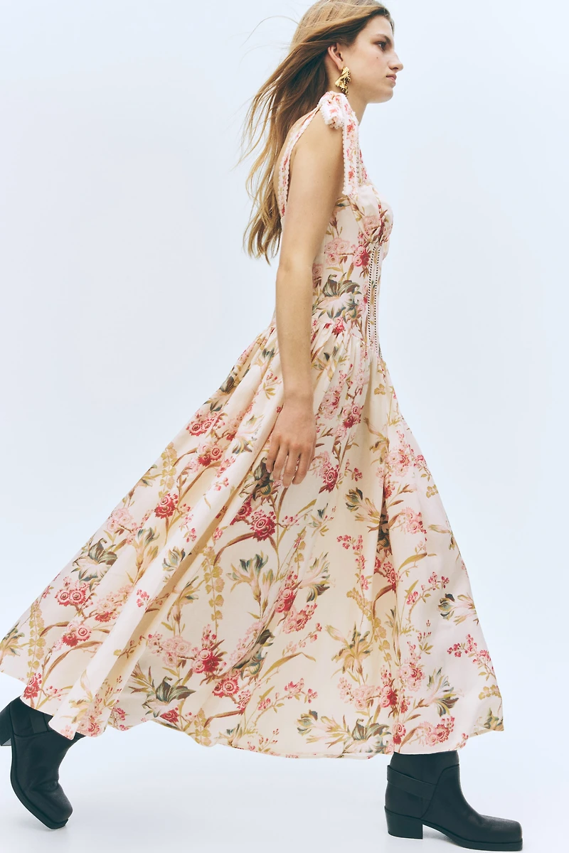 Long dress in an airy woven linen and viscose blend with a fitted bodice and gently flared skirt. Wide, tie-top shoulder straps and a sweetheart neckline, both with scalloped lace trim,. Concealed zipper at back. lined underwire cups with gathers, ladder lace insets at front, and a gathered seam at waist.