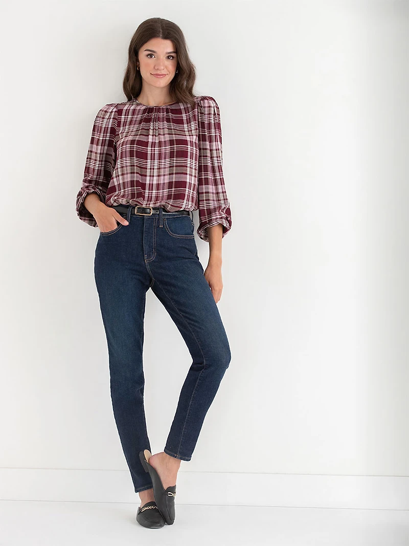 Level up your casual looks with this patterned blouse. The keyhole back, subtle puff shoulders and elastic cuffs make it a versatile piece for easy, no-fuss outfits.
