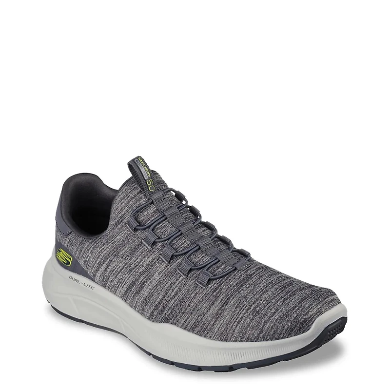 Enhance your fitness routine with these men's Skechers Equalizer 5.0 Lemba charcoal athletic shoes. Boasting a jersey fabric upper, these round toe shoes are styled with bungee lacing for a quick and secure closure. The logo detail at the side adds to subtle visual appeal, and the pull loop improves convenience. The Relaxed Fit design provides roomy, comfortable fit, and the Air-Cooled Memory Foam insole offers superior cushioning. Built with vegan-friendly materials, these walking shoes feature EVA midsole and EVA outsole for enhanced flexibility and durability.