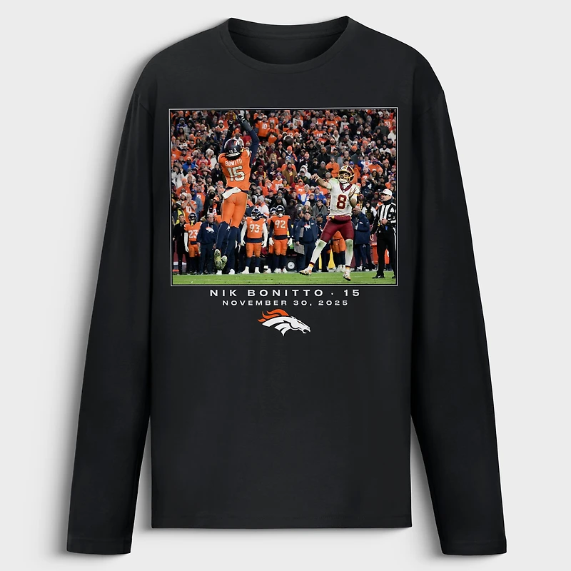 Celebrate the electrifying play of Nik Bonitto with this Denver Broncos NFL Flash Features Week 13 Long Sleeve T-Shirt. This shirt commemorates Bonitto's game-sealing pass deflection on Washington's two-point conversion attempt in overtime. Designed with a relaxed fit through the shoulders, chest and waist, this shirt offers superior comfort. The lightweight feel will keep you comfortable all day and the long sleeves will provide a little extra protection from the elements.
