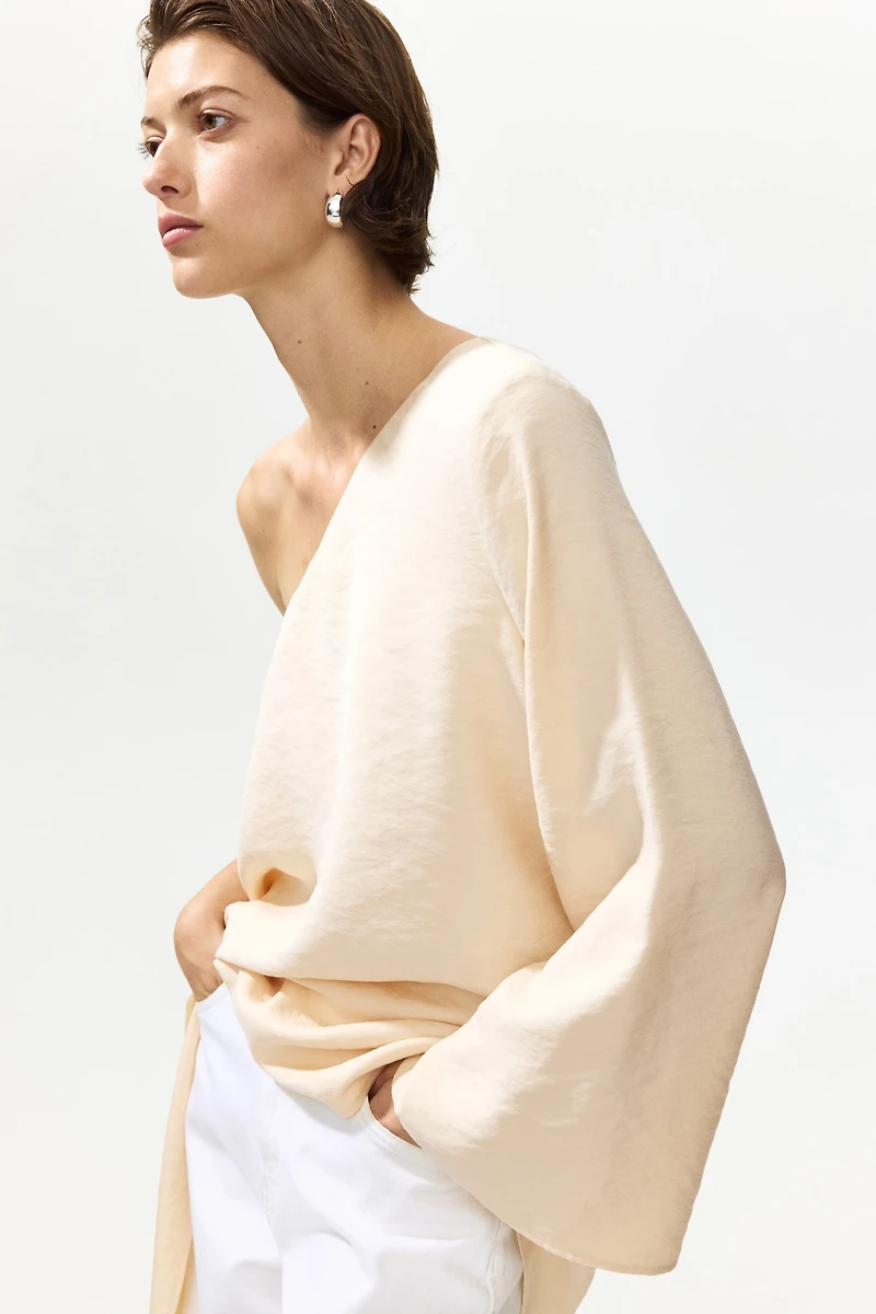 One-shoulder top in a woven modal blend with an asymmetric neckline and asymmetric hem. One long sleeve.