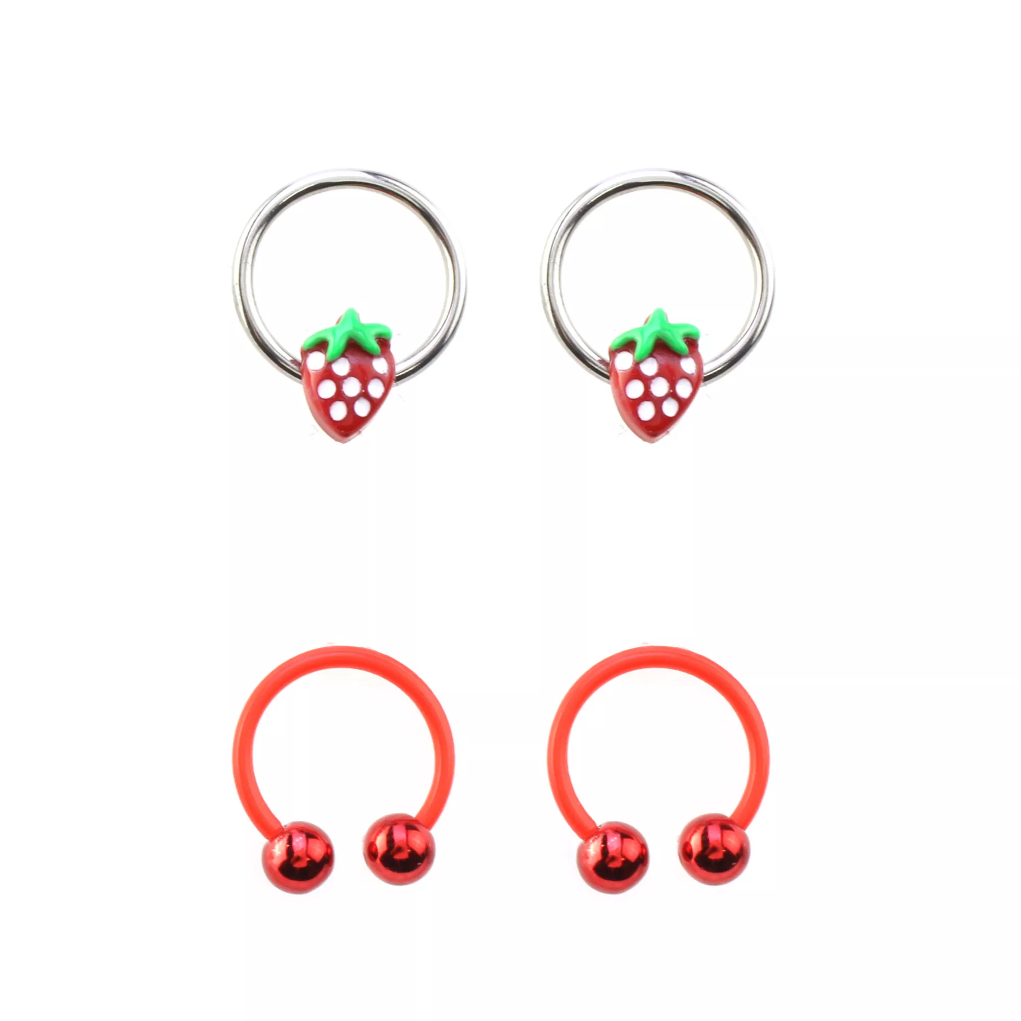 Multi-Pack Strawberry Red and Silver-Tone Horseshoe and Captive Rings 2 Pair - 16 Gauge