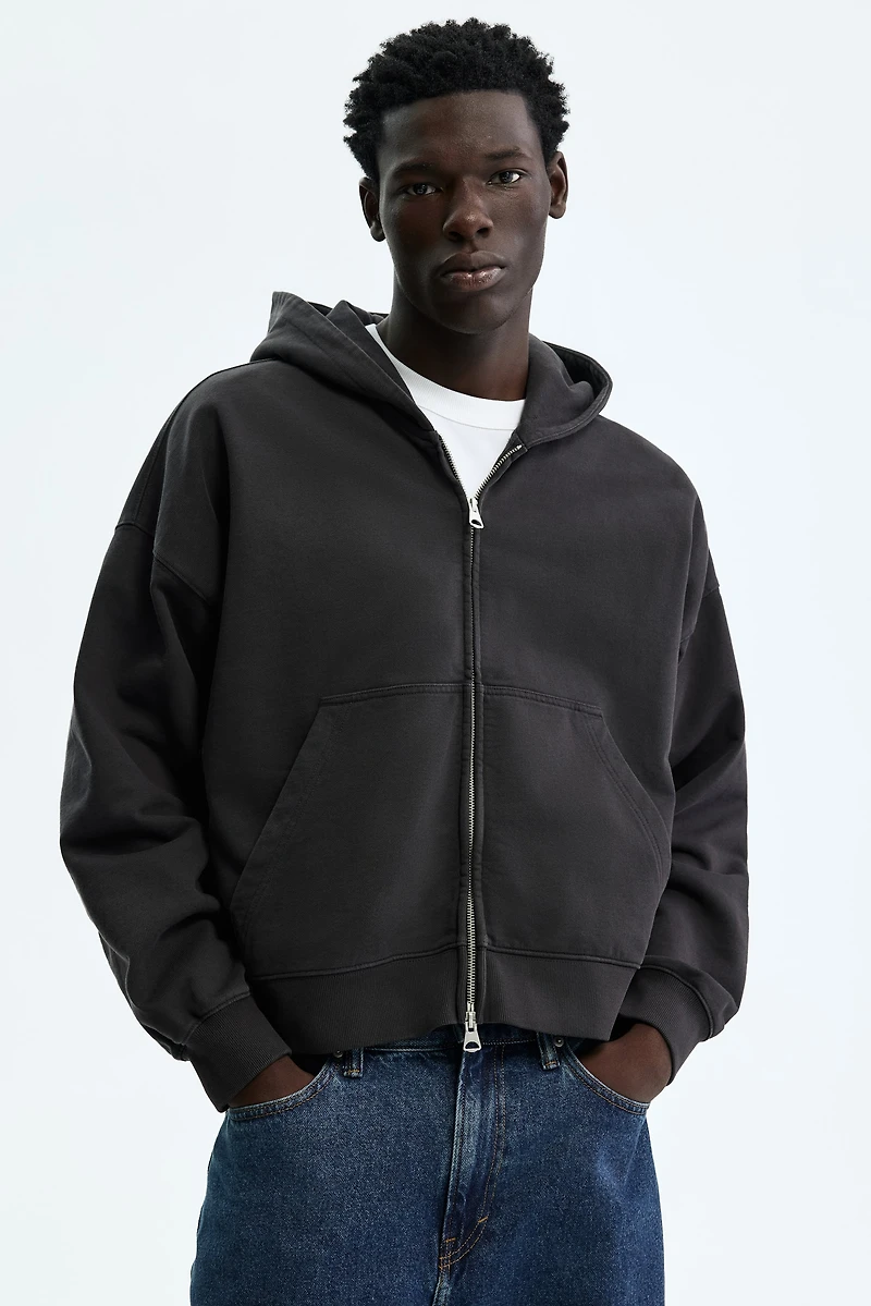 Oversized sweatshirt jacket in lightweight cotton with an extra-loose silhouette. Jersey-lined hood, zipper at front, and front pockets. Dropped shoulders, long sleeves, and ribbing at cuffs and hem.