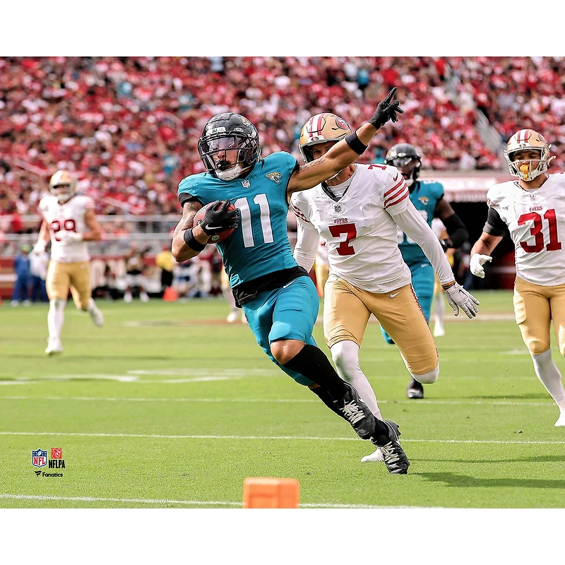 Relive the excitement of Parker Washington's performance with this 2025 Week 4 Photograph. This photo immortalizes Washington's electrifying punt return touchdown, capturing the energy and excitement of the moment. Perfect for any Jaguars fan, this photo is a great way to celebrate a rising star and a memorable play.