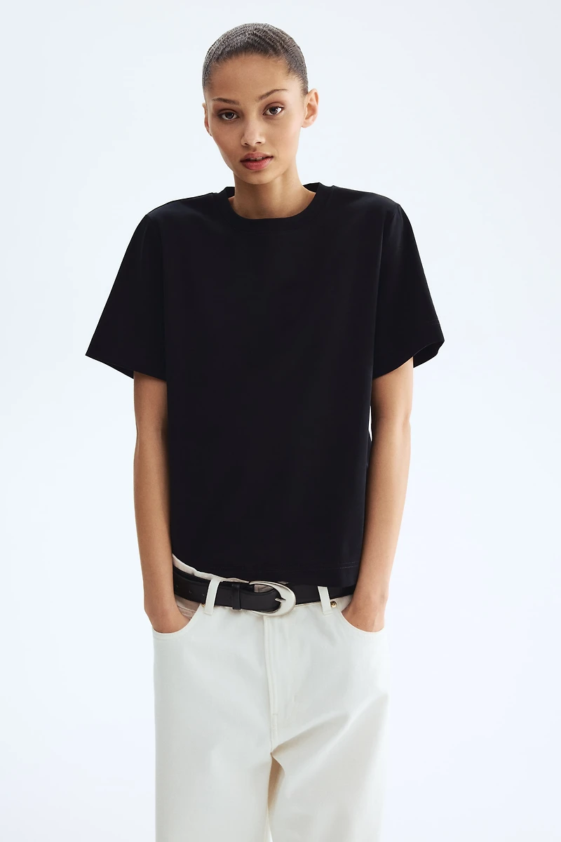Loose-fit T-shirt in thick pima cotton jersey. Crew neck, dropped shoulders, and sleeves finishing just above elbows.