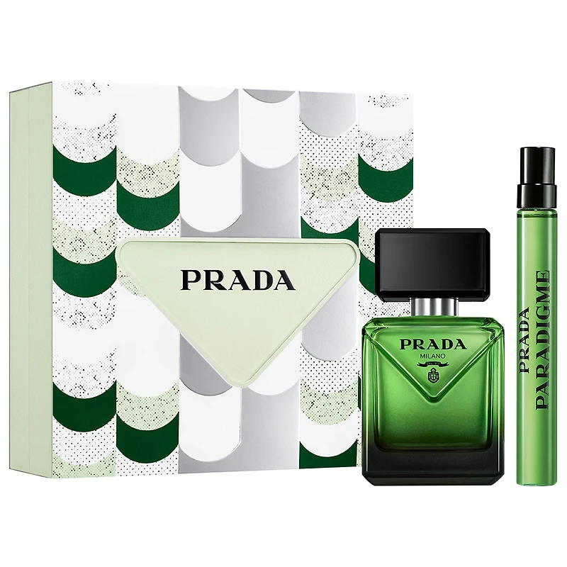 Fragrance Family: Earthy & Woody Scent Type: Citrus & Woods Key Notes: Bergamot, Geranium, Ambery Woods Set Description: This two-piece travel set features Paradigme Eau de Parfum in a full-size and travel-size spray. About the Bottle: An architectural silhouette of radical elegance and an avant-garde statement through the tactile tilted Prada triangle. A bottle lacquered in an intense and alluring black to green gradation, the house's iconic color. About the Fragrance: Opening an olfactive para