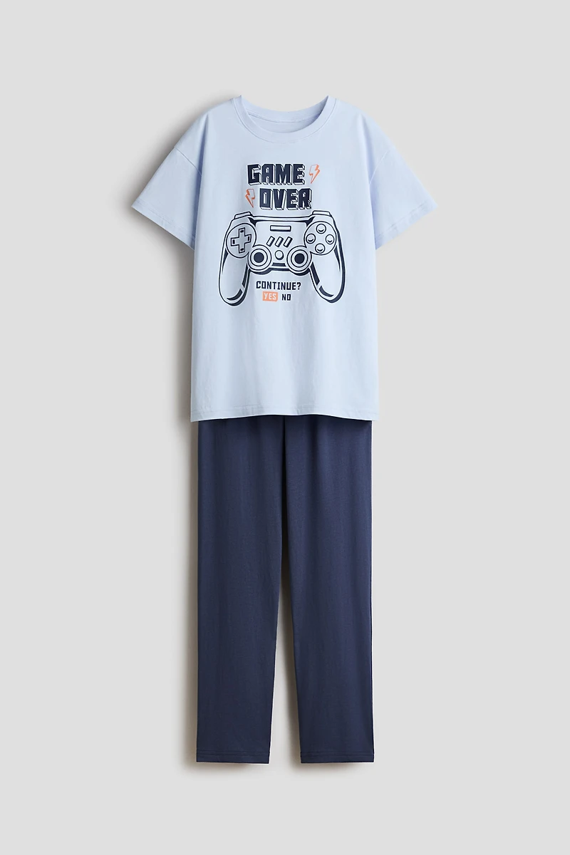 Pajamas in soft cotton jersey with a printed design. Shirt with a ribbed round neck, dropped shoulders, and short sleeves. Pants with an elasticized waistband and straight legs.