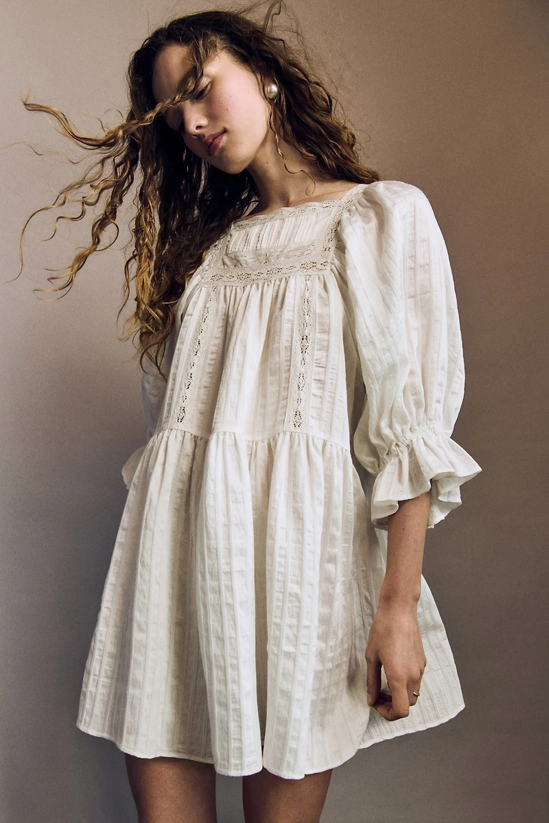 Short, loose-fit dress in woven textured fabric with lace insets. Lace-trimmed square neckline, narrow yoke at front with pintucks, and voluminous 3/4-length puff sleeves with flared, elasticized cuffs. Gathered seam at waist and gently flared skirt. Unlined.