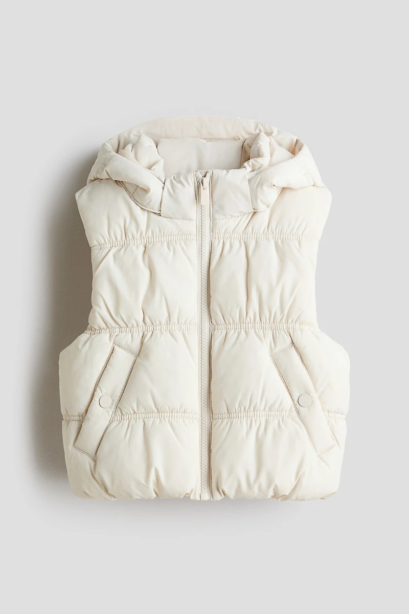 Padded vest with a detachable hood. Stand-up collar, zipper at front, and welt front pockets with snap fastener. Concealed elastic at hem. Lined.