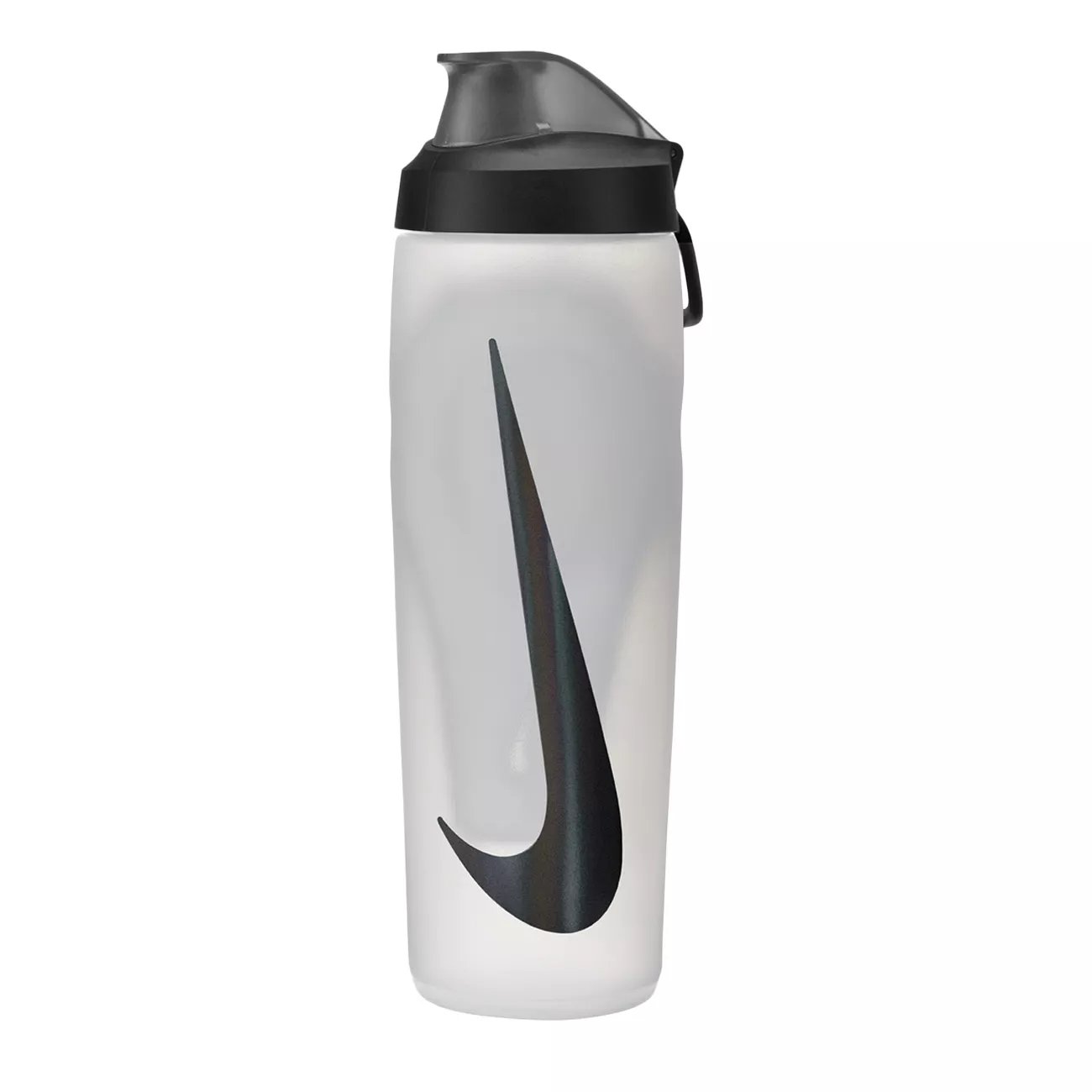 Quench your thirst while improving performance at the gym or playing on the court with this Nike Refuel 24 oz locking lid natural/black water bottle. Made with a low density polyethylene , polypropylene, and thermoplastic elastomer shell, this squeezable water bottle is leakproof and has a flip-top lid that locks into place for easy closure. Features include a foldable handle for easy storing and carrying, strategically placed overlay for an extra layer of comfort and grip, and Nike Swoosh logo detail for iconic sporty vibes.