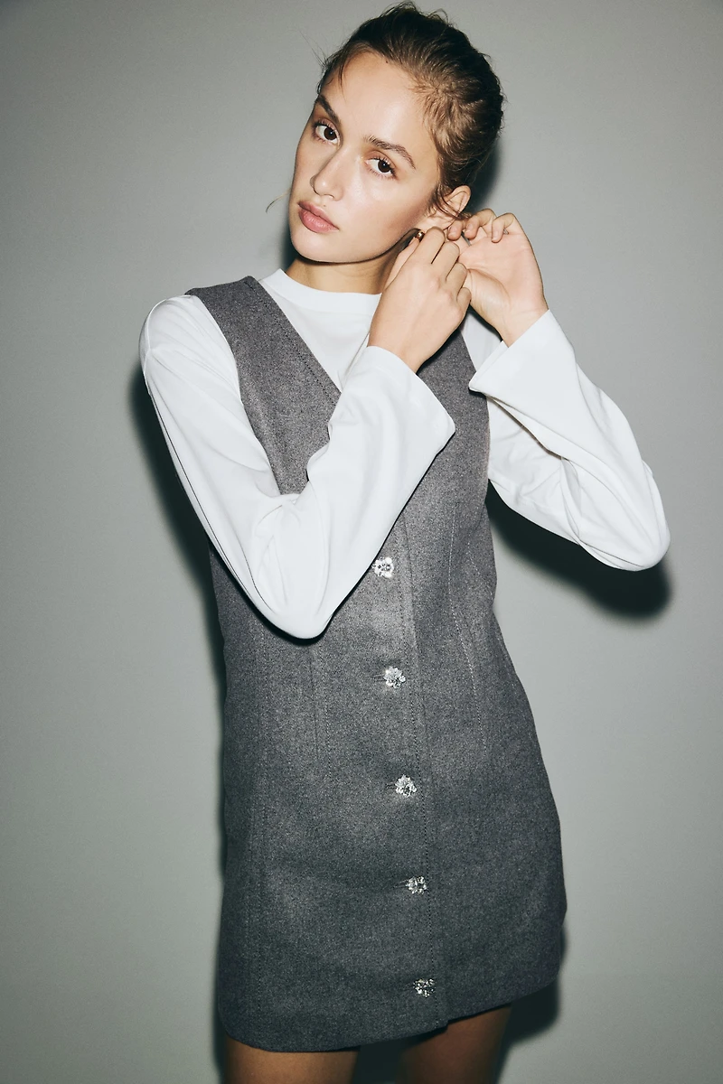 Sleeveless mini dress in brushed woven fabric with a flattering silhouette. V-neck, rhinestone buttons at front, and shaping seams at waist. Lined.