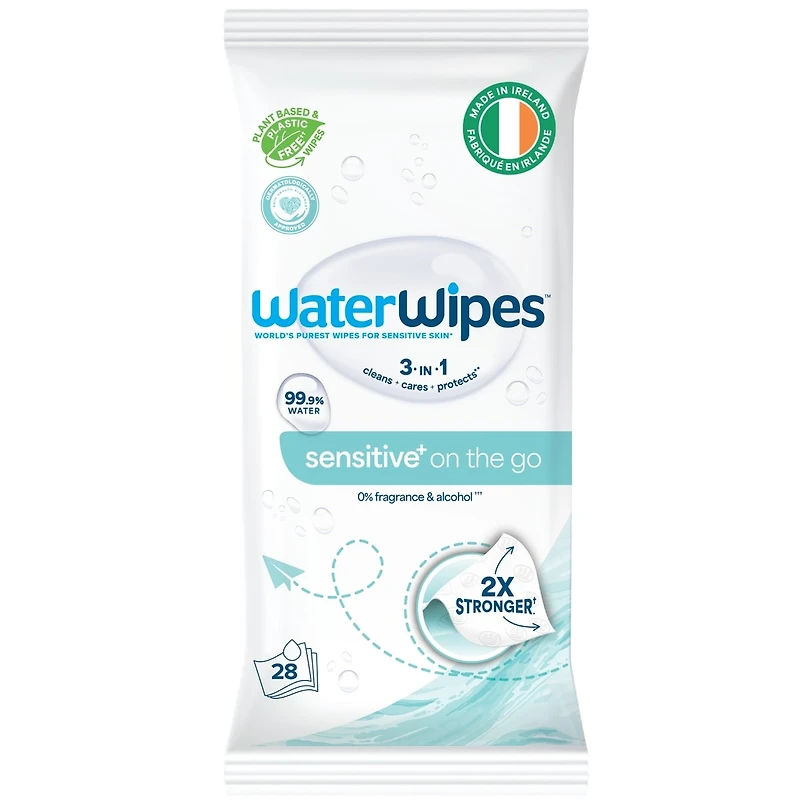 • • MADE FOR OUT & ABOUT: Crafted to gently clean and protect skin, these Sensitive+ On-The-Go unscented wipes have just two ingredients - 99.9% purified water and a drop of fruit extract. <br> • EVERYDAY USE ON SENSITIVE SKIN: When life plays dirty, WaterWipes plays it clean. Ideal for cleaning small messes and refreshing skin on-the-go, these disposable wipes make the perfect daily essential.<br> • 3-IN-1 SKIN CARE BENEFITS: Made using minimal ingredients, our wipes have a neutral pH range, which helps protect the natural skin barrier. This makes them ideal for cleaning small messes, refreshing skin and travelling. <br> • 2X STRONGER: Upgraded for more versatility, WaterWipes are now thicker, softer & 2x stronger to tackle tougher messes while keeping the same, trusted purity.<br> • PURE & GENTLE FORMULA: WaterWipes unique 7 stage water purification, requires minimum ingredients, with 0% fragrance and alcohol. <br> • PLASTIC-FREE*, PLANT BASED WIPES: Suitable for eczema-prone skin, WaterWipes are Dermatologically Approved by the Skin Health Alliance, accepted by the National Eczema Association of America and registered by the Vegan Society.<br> • *Claim does not refer to the full product lifecycle nor packaging. Wipes made from regenerated cellulose.