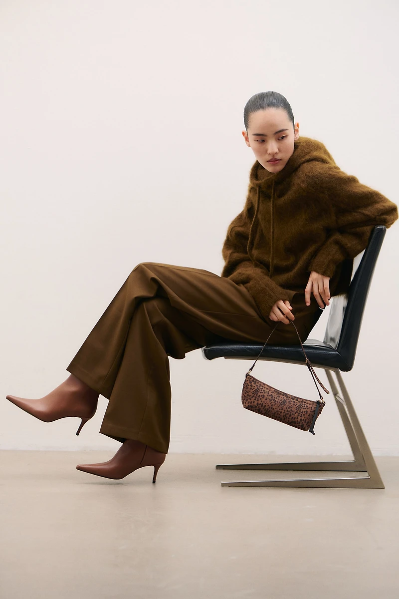 Shoulder bag with a textured, napped finish. Adjustable shoulder strap and a zipper at top with a long zipper pull in coated fabric. Lined.