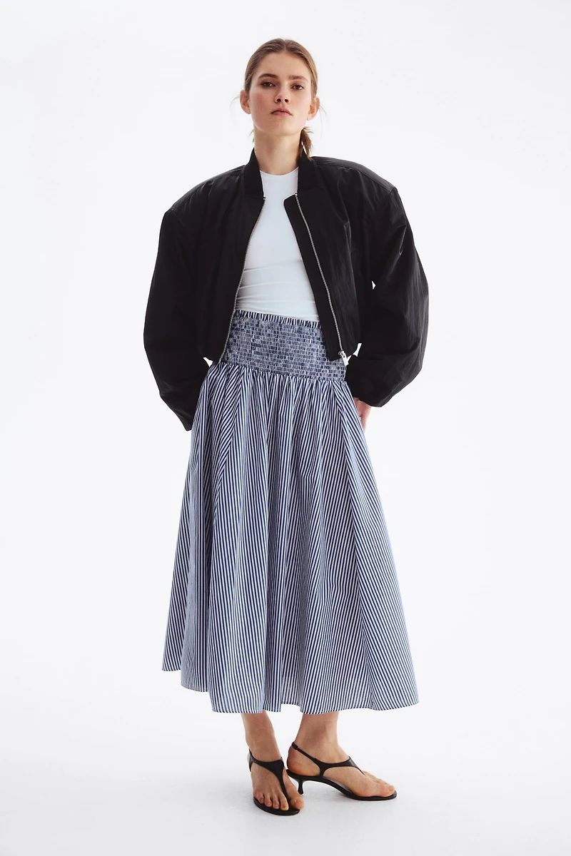 Flared midi skirt in woven fabric. High waist with a wide, smocked waistband. Unlined.
