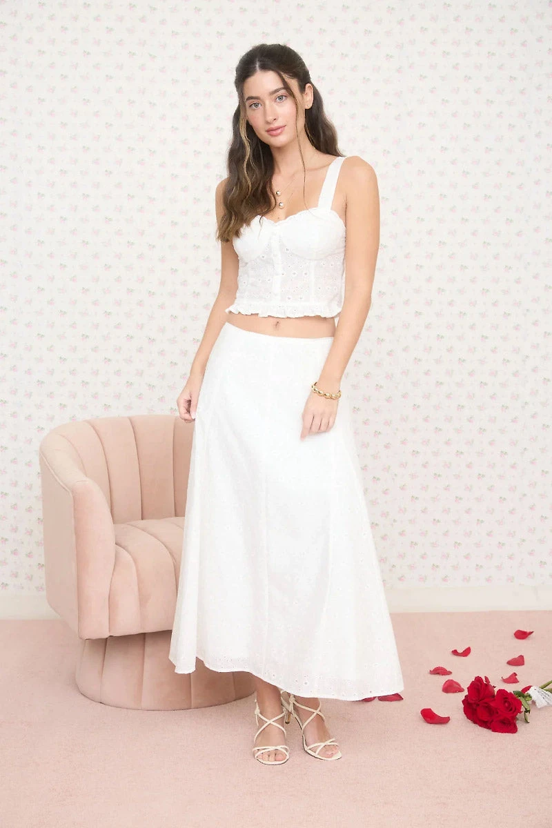 blu pepper's Softest Cloud Midi Eyelet Skirt is all in the details subtle eyelet accents and flowy a-line give it that vintage feel. High-waisted, breathable, and fully lined for a fit that's as easy as it is chic.