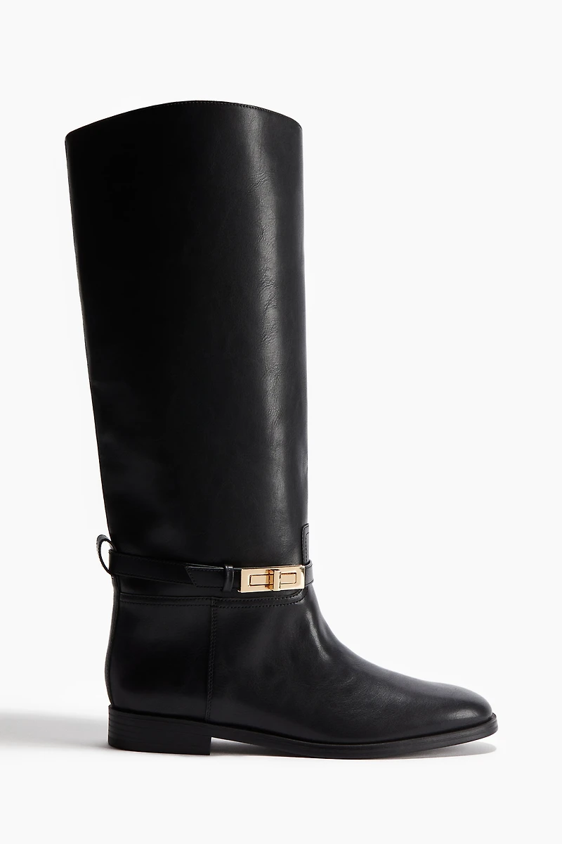Knee-high boots with rounded toes, a decorative ankle strap with a metal buckle, and low block heels. Jersey lining and insoles.