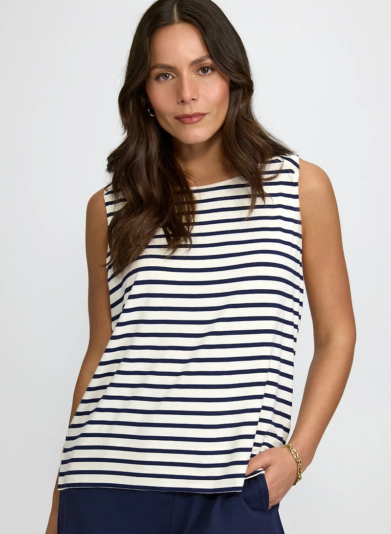 Perfect for warm-weather days when you want a light, effortless look with subtle stripe detail. Style with our jogger pants and a handbag for a polished finish.Stripes throughoutRound neck Highest shoulder point: 23"