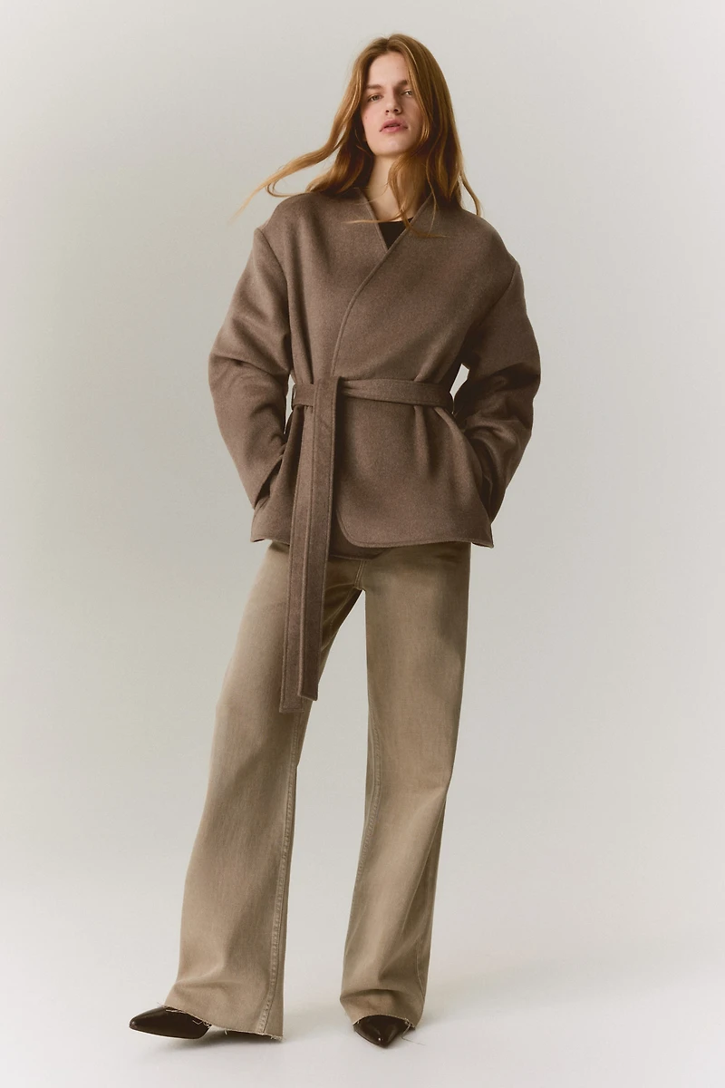 Short coat in felted fabric. Wrapover front, removable tie belt at waist, and discreet side pockets. Dropped shoulders and long sleeves. Unlined.