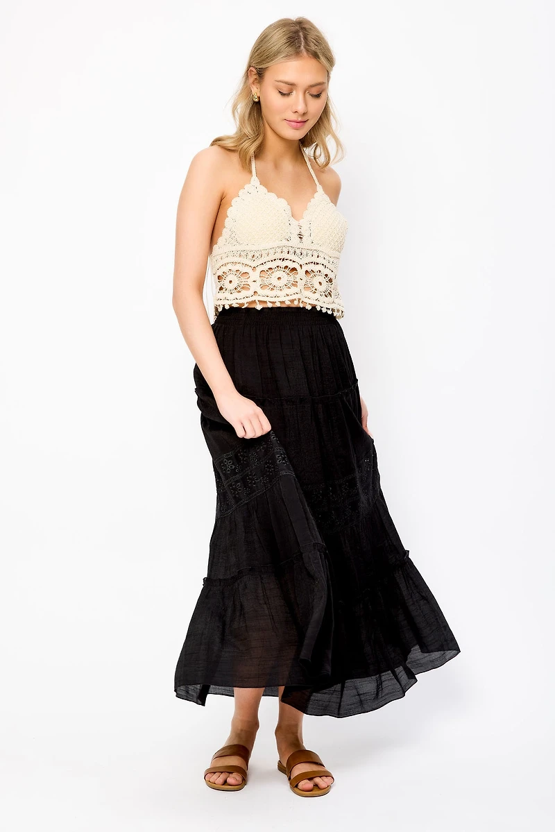 Tiered Maxi Skirt with Floral Eyelet Trim