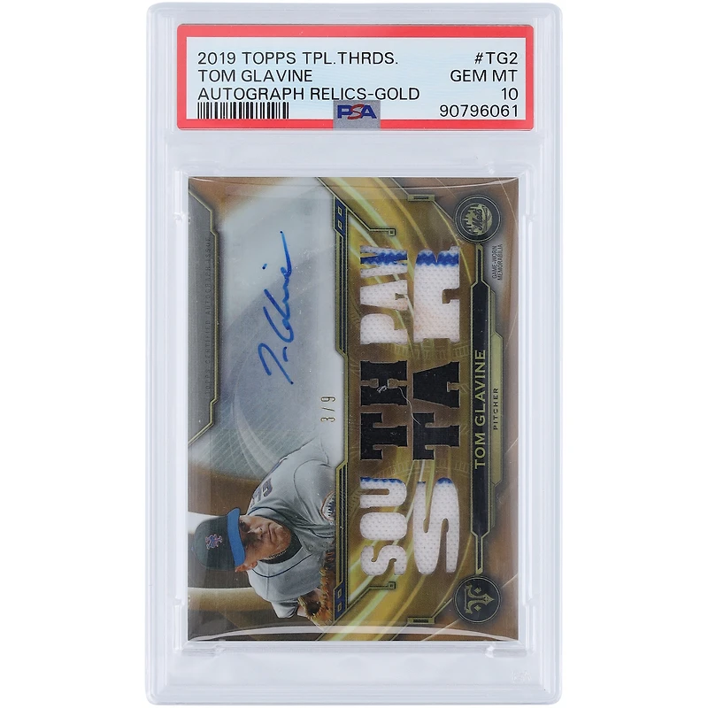 Elevate your collection of New York Mets memorabilia by picking up this Tom Glavine autographed 2019 Topps Triple Threads Gold Relic #TTAR-TG2 #3/9 PSA Authenticated 10 Card. Encapsulated in a tamper-proof acrylic case, this collectible features a striking signature from Tom Glavine to make it a must have addition for any die-hard fan or serious collector.