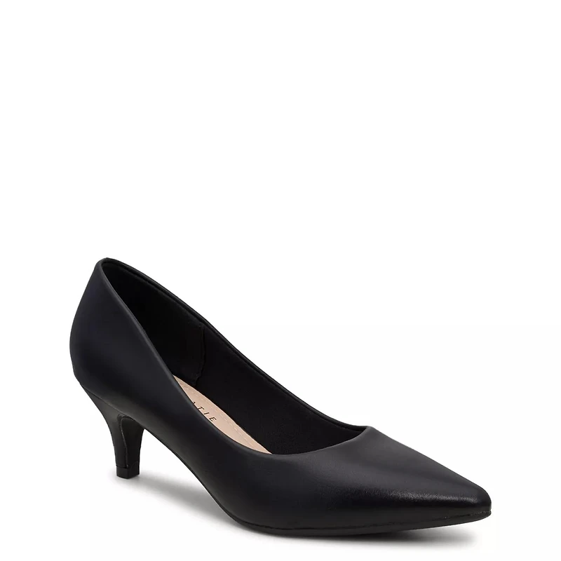Step out with modern flair in these women's Kelly & Katie Ainsley black low heel dress shoes. Fashioned with pointed toe design, these pumps have durable faux leather upper, perforated footbed for comfort, synthetic insole with padding, faux leather midsole, trendy kitten heel, and grippy patterned TPR sole. This style is exclusive to Designer Brands Canada.