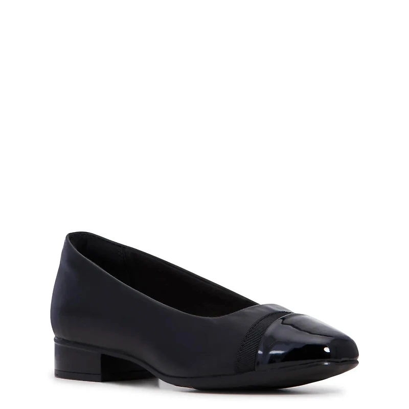 A pair that allows you to be at ease throughout your day, these women's Clarks Juliet Monte black wide dress shoes channel the gap between comfort and style. A textile upper featuring a grosgrain ribbon detail and a contrast toe elevates this ballet-flat inspired style. Its short heel and durable rubber outsole make it an easy choice for workweek wear, and Ultimate Comfort features including an Ortholite® footbed wick away moisture and dull impact.