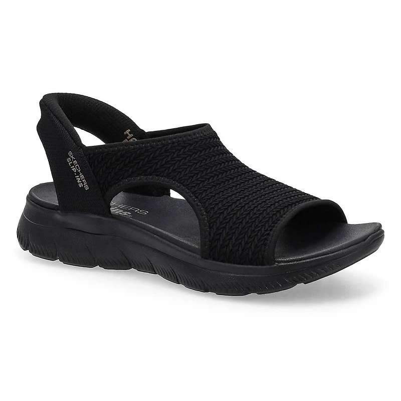 Enjoy sunny days in breezy comfort with the Hands Free Slip-ins: Summits Sweetly Evolved black casual sandal from Skechers. Designed with Skechers' Heel Pillow, this vegan slip-on sandal features a textured knit upper with an H-band silhouette, a Skechers Hands Free Slip-ins back heel, and a cushioned Yoga Foam footbed.