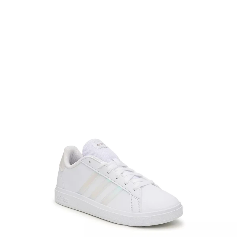 She'll standout cool in court-inspired profile of these girls' adidas Grand Court 2.0 K cloud white/iridescent/cloud white sneakers. Designed with durable synthetic leather-like upper made with a series of 50% recycled materials, these tennis-inspired sneakers have a round toe front and secure lace-up closure. Features include the iconic 3-Stripes side detail and heel panel with iridescent highlights, soft textile lining and insole, lightweight EVA sockliner, and a supportive rubber cupsole with honeycomb patterned tread.