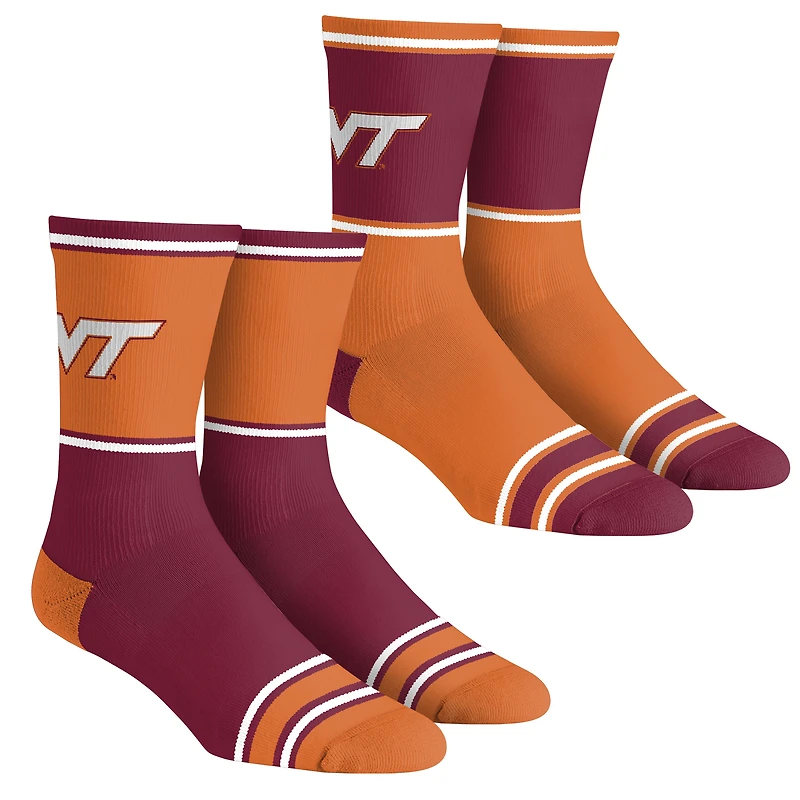 Let your young fan step up their sock game with this Virginia Tech Hokies 2-Pack Color Block Crew Socks Set from Rock Em Socks. With two unique designs, these Virginia Tech Hokies socks will add some team flair to any young fan's wardrobe. With a comfortable fit and bold colors, these socks will let everyone know that they're a fan of the greatest team in the league.