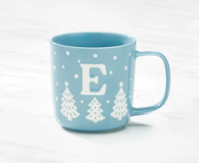 Monogram Mug Forest design and Letter E, Blue and White, 370ML