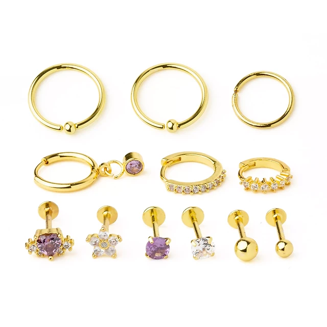Multi-Pack CZ Purple and Clear Goldtone Cartilage Earrings 12 Pack - 18 Gauge