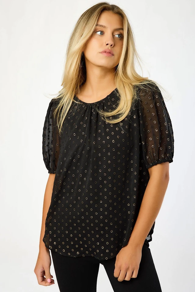 Crew-Neck Balloon 3/4 Sleeve Glitter Top with Shirttail Hem