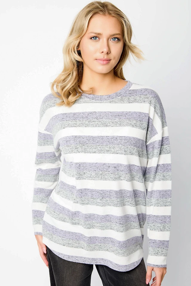 Stripe Scoop-Neck 3/4 Sleeve Sweater with Shirttail Hem